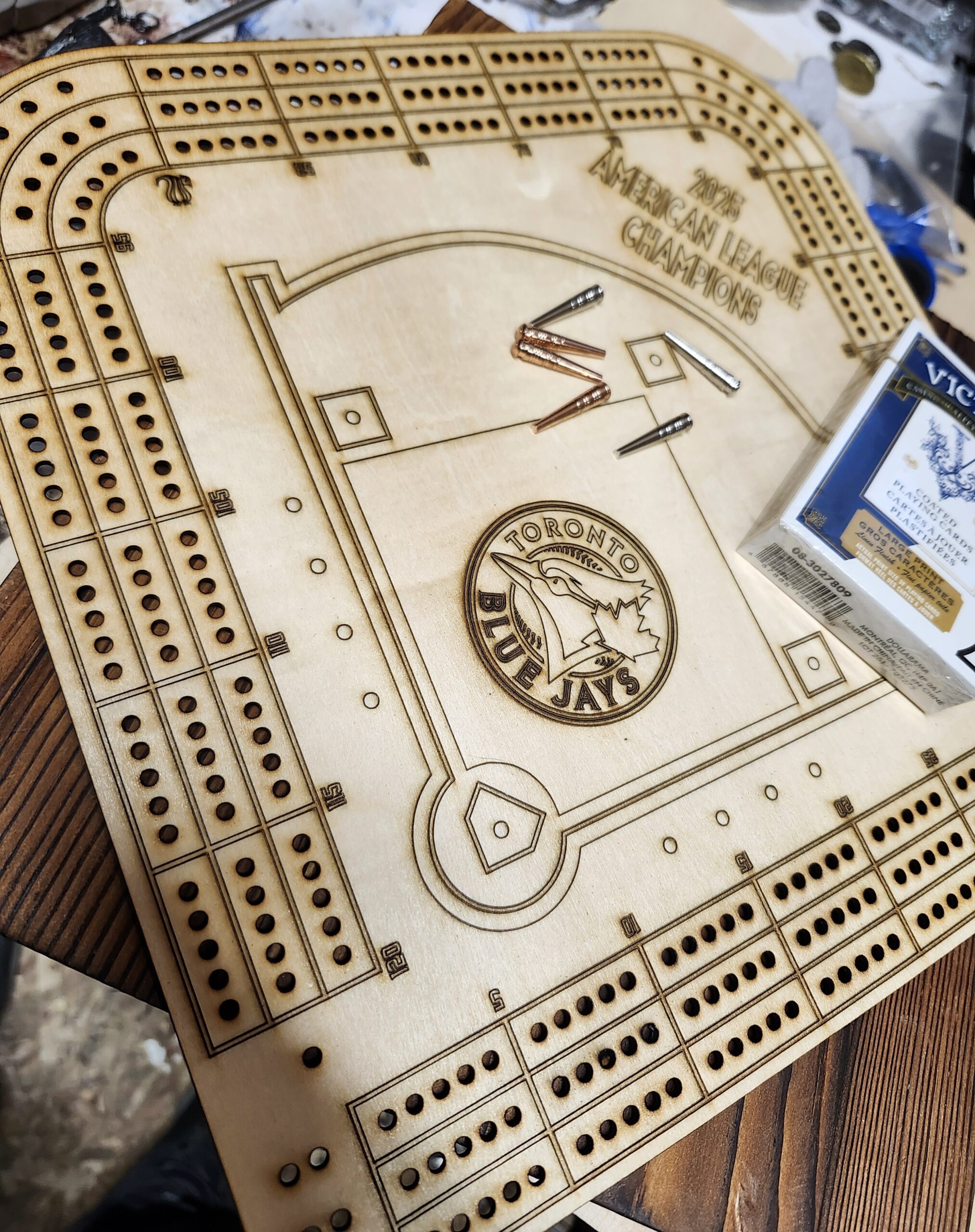 You get a crib board, new deck of cards and brass pegs.